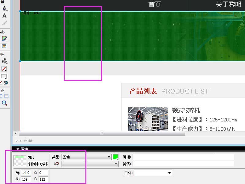 5、這時候利用切片工具,選取你想要切的圖,本文以圖片的banner為主,進行選擇。注意,選取的時候,會有一個十字的標志,可以進行定位處理。如下圖切片選中之後,可以看到選中位置、大小以及選中之後會變色。