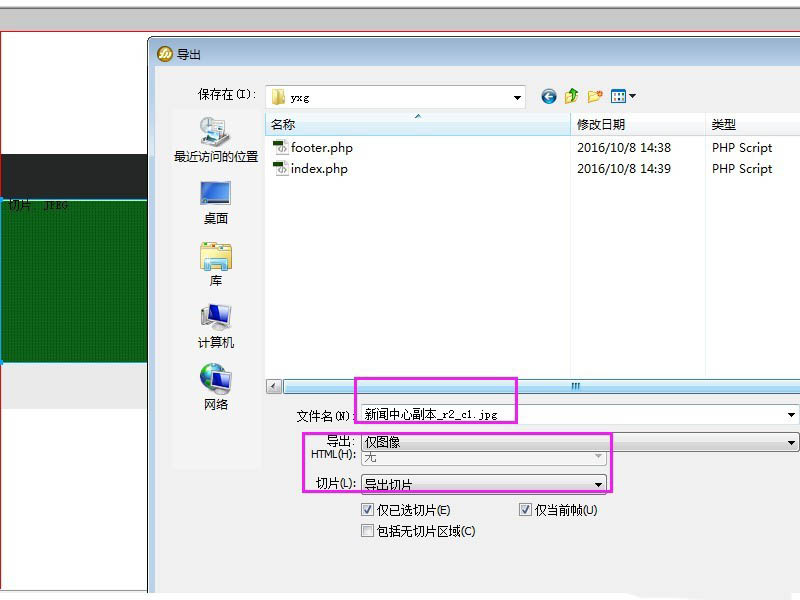 7、點擊“導出切片”可以根據自己的需求進行切片位置、名稱的填寫和選擇。如下圖的,其中導出的除了可以是圖片之外,還可以是html+圖像等,根據需求進行選擇,如果是切圖可以只選擇圖片