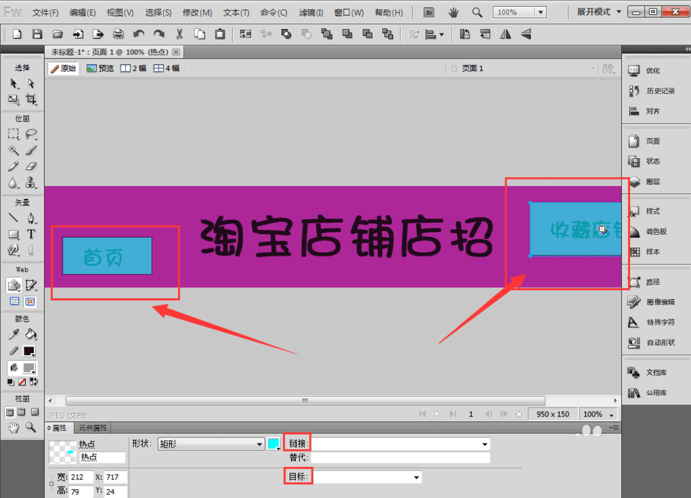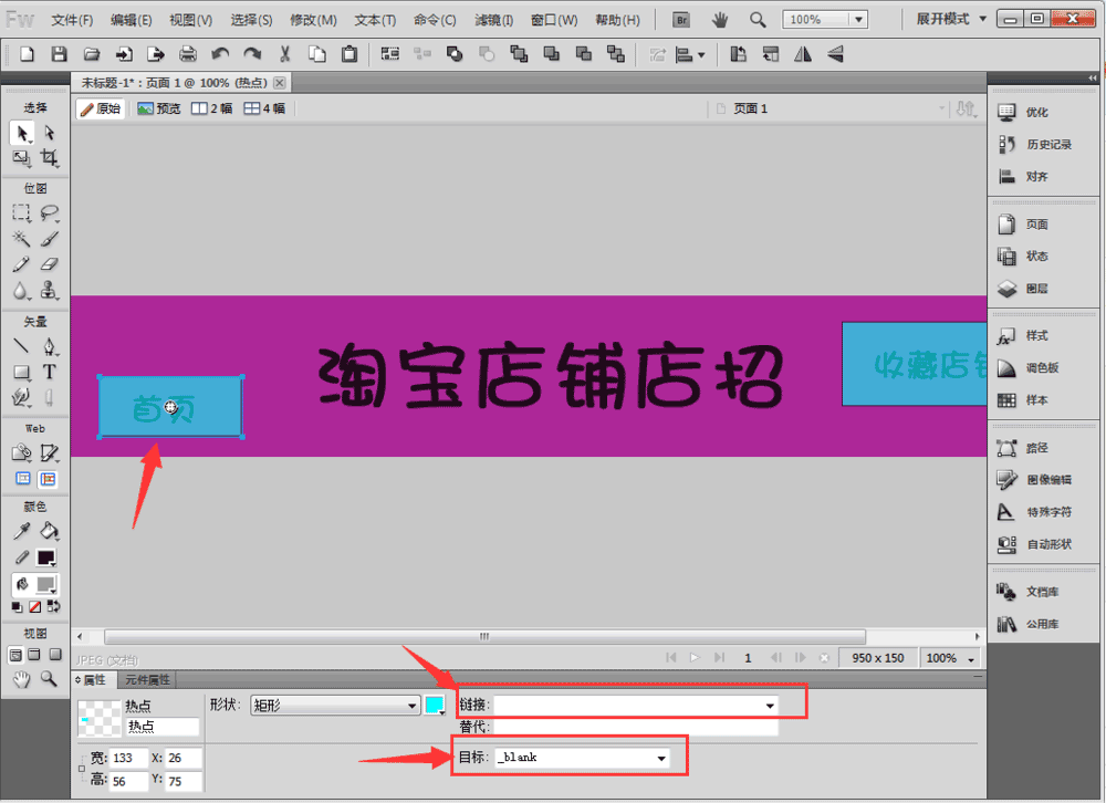 4、在店招上要加鏈接的地方畫個矩形,所選中的范圍就是點擊可以加鏈接的地方。將店鋪首頁的鏈接和收藏鏈接分別添加進去就可以了。注意目標要選擇_blank!