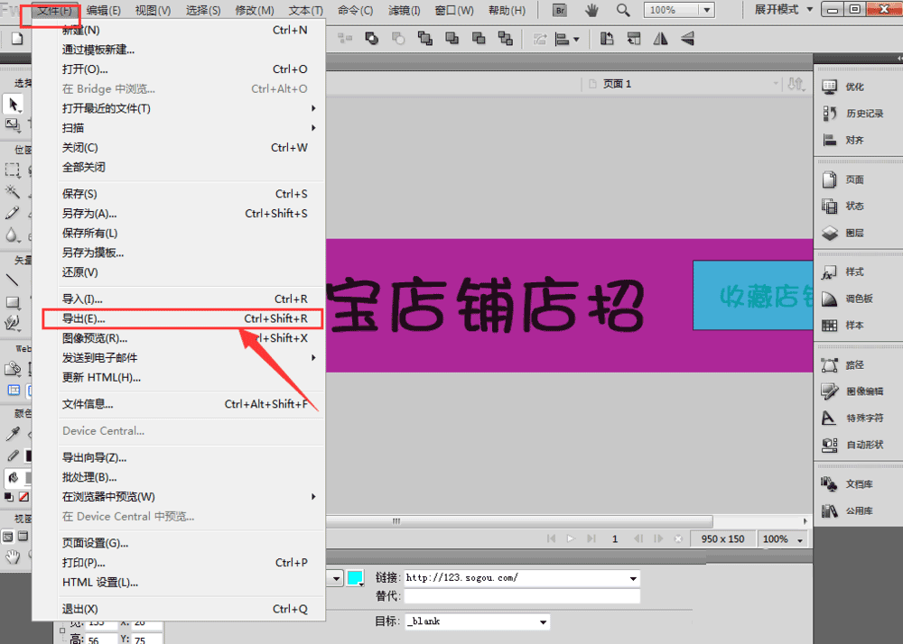 5、加好鏈接之後點擊【文件】,【導出】。快捷鍵是Ctrl+Shift+R。注意一定是HTML和圖像。點擊保存。