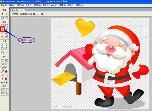 1、用FW打開想要操作的圖片,選擇左側列表中的魔棒工具,點選圖片中的白色區域,則白色的背景會自動消除變成透明,如圖所示: