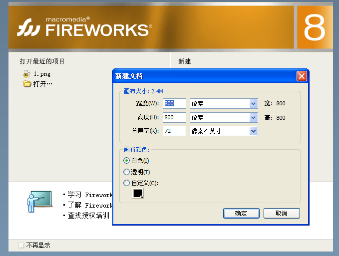 2、然後我們看見Fireworks8的歡迎程序