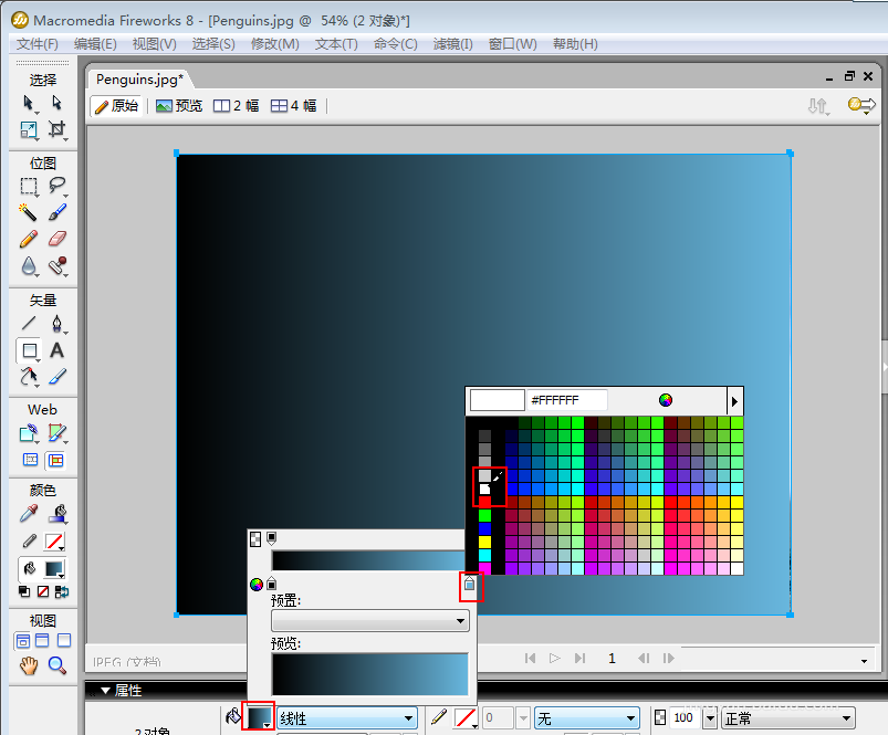 4、使用黑白線性漸變:單擊左側下方的小方塊選取顏色“黑色”,單擊右側下方的小方塊選取顏色“白色”