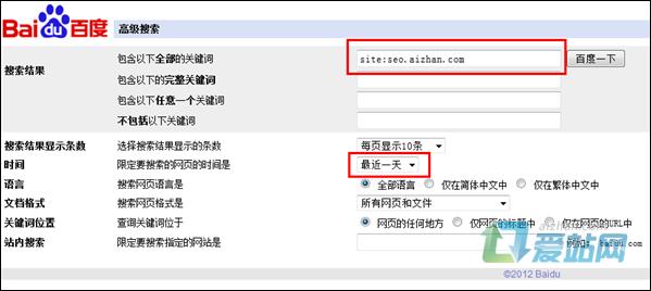 這樣就能查詢seo.aizhan.com最近一天收錄的搜索結果。當然我們也可以查詢最近一天的外鏈或者其他信息。