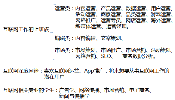 那麼我們的目標用戶就可以大體上分為從事互聯網工作的上班族、互聯網深度網迷、互聯網相關專業的學生等。