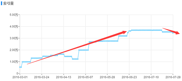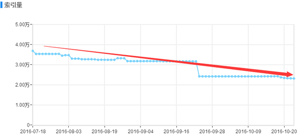 如上圖小編是今年三月份開始接手的這個網站項目,當時並木有通過逆向思維去解決網站存在的收錄問題,只是經驗性的簡單分析了一下網站的日志,在站長後台增加了sitemap推送和在服務器上部署了主動推送功能,短時間內的確效果明顯,該頻道的頁面收錄呈現良好的上升趨勢,可是通過圖表可以看出,收錄量在達到6月份的時候一直到7月份中旬沒有進行任何明顯的變化,從7月中旬之後小編當時就有一種危機感,職業上的直覺告訴我,接下來一段時間該頻道的收錄會呈現大幅下降的趨勢,結果果不其然,如下圖: