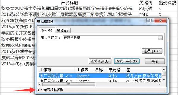 在淘寶搜索“直觀的屬性詞”,在搜索結果頁從第一個相關寶貝的標題開始篩選出候選關鍵詞,將關鍵詞在本頁的出現的次數記錄入表格,以備最後挑選關鍵詞之用。根據我的經驗,一般統計10-15個關鍵詞就可覆蓋本頁的絕大部分關鍵詞,完全夠用了。使用浏覽器的ctrl+f查找功能可以快速統計本頁面某關鍵詞出現次數。