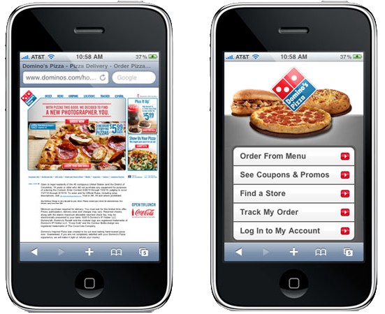 桌面端網頁在移動端設備上首要的障礙就是導航的使用。看看下面Domino批薩的案例,它的桌面端和移動端網頁的對比就相當明顯,移動端頁面經過優化之後的體驗就完全不同。簡單說來,優化後的移動端頁面更加干淨,有著更容易導航的CTA按鈕