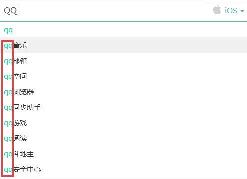 我們再來看相同點,相同點是核心關鍵詞在第一位,如,‘射擊’,也就是說下拉聯想詞是完全依據用戶所搜索的關鍵詞來自動匹配的,再來多看一個例子,如搜索‘QQ’,如圖所示,我們看到的結果也是以核心關鍵詞‘QQ’來匹配的。
