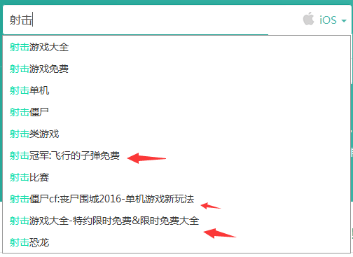 如圖所示:當我輸入‘射擊’這個行為關鍵詞時,就會匹配出若干下拉聯想詞,蘋果這樣做的目的,當然是為了使用戶有更好的用戶體驗,用多元化的搜索結果滿足不同用戶的搜索目的。這一塊ASO就可以充分利用了,紅色箭頭所指部分,是ASO做上去的三個例子。那麼問題來了,ASO該怎麼去做下拉聯想詞呢?我們來分析一下‘射擊’這個關鍵詞相關的聯想詞。