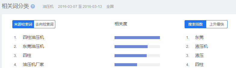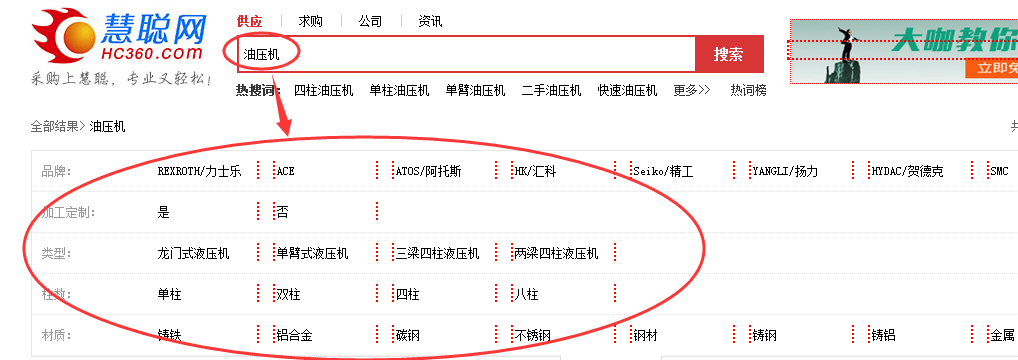 很多大型網站基本都對行業進行了屬性分類,這些屬性跟關鍵詞組合起來也是用戶可能搜索的關鍵詞。因此,通過采集同行網站的屬性分類模塊,也是一個挖掘途徑。比如慧聰網上面對油壓機的屬性分類模塊,就可以采集到很多關鍵詞(如下圖所示)