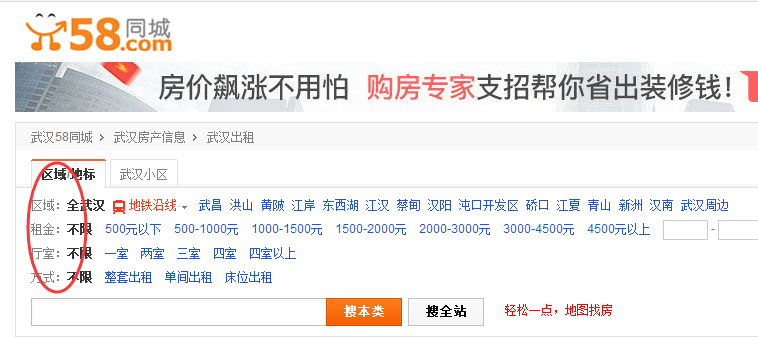 我們就以武漢58同城的房屋出租作為案例進行講解。如下圖所示,武漢58同城將武漢房屋出租的用戶需求分為了“區域”、“租金”、“廳室”、“方式”4種屬性