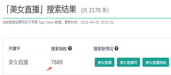 ‘美女直播’關鍵詞指數,我用ASO114優化工具查詢的‘美女直播’關鍵詞的指數是7689,對於一個行為關鍵詞來說,這是一個非常理想的指數,也是同類競爭非常激烈的關鍵詞。這裡要強調一點,7689的指數並不是說就是有7689位用戶在搜索,這個數值是一個參考維度,以7689的這個指數來看,保守估計日均搜索在1萬人次以上。最次值是4605,如果某個關鍵詞處在這個指數內,那基本是沒有用戶去搜索,多出現於未打來市場的品牌詞。