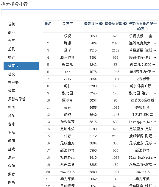 行業詞:搜索指數排行,我們可以查看商業、天氣、工具、旅行、體育、社交等各行業高指行業詞,從搜索結果數中開發者可以判斷競爭難度,然後再查看搜索結果排名第一的應用,了解競爭對手排名與在關鍵詞的一些情況。