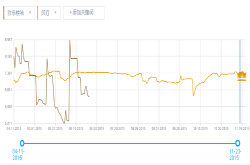 從下圖中可以看出,風行這個詞的熱度一直較為平穩,而另一個詞的起浮就較為嚴重,可以說這個詞刷的時候並沒有規律,一會刷一會不刷,就造成了這種巨大的起浮。