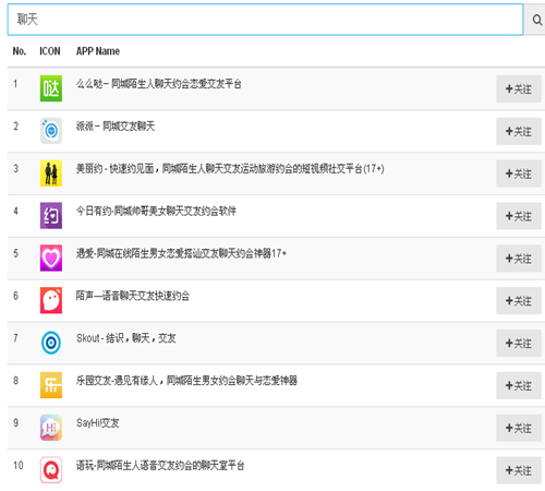 關鍵詞的選擇當然還要參考競品詞,利用相關ASO工具輸入聊天這個關鍵詞時,就能找到該關鍵詞的競爭品了,如若你的應用也是一款社交軟件的話,那麼其下面的所有應用都會是你的競爭對手,從圖中可以看出。