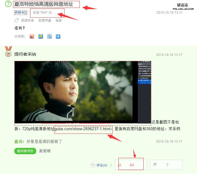 接下來我們就需要找朋友點贊,當問答有十幾個贊的時候,就基本上已經被收錄了,此時我們就可以去一些知道互贊,互答等qq群推廣推廣,當由用戶通過 這個知道到達我的網站帖子獲得他想要的結果,有的是會回來點贊的就像這個知道40多個贊基本都是普通用戶點的而不是刷的,在這種狀態下這個知道就更容易被 百度推薦並出現在搜索結果中獲得好的排名。慢慢地陷入一個良性循環,在這期間我們還需要經常去我們網站的帖子看網盤有沒有失效等等,只有真實有效的分享才 能獲得用戶的認可。這條知道直到目前已經帶來了數萬流量雖然顯示的只有7647條閱讀,但這裡的統計有缺失,並非那麼的精准。
