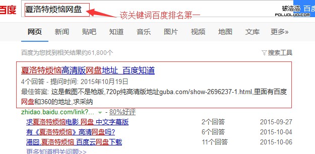 由於百度對於自家產品給予的排名相對較高我們除了在論壇貼吧引流外還選擇了百度知道這一平台。而在知道中我們的標題用:xxx網盤地址、xxx 高清網盤地址、xxx下載鏈接、求xxxx網盤等等帶上“求”、“網盤”、“鏈接”這樣的詞匯更加符合用戶的搜索習慣,這樣的關鍵詞放在標題中當用戶搜索 相關關鍵詞之後更容易出現在搜索結果中。如圖我這“夏洛特煩惱高清版網盤地址”已經是“夏洛特煩惱網盤”、“夏洛特煩惱高清網盤地址”等關鍵詞搜索結果的 第一位。