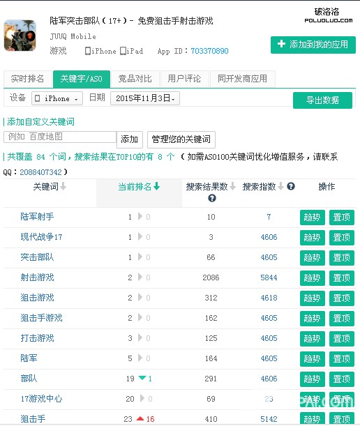 如果實在不知道選詞沒關系,競爭對手會告訴你,善於分析,勤於記錄,如果應用是一款戰爭游戲的話,那麼射擊、射擊游戲、狙擊游戲、戰爭游戲等關鍵詞必然是目標用戶搜索最多的關鍵詞了,如圖所示: