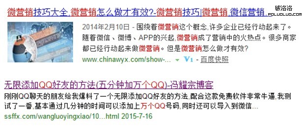 第一個標題滿足了百度用戶搜索的需求,比如技巧大全需求、微營銷怎麼做的需求,標題上需求滿足的充分,內容中滿足的也非常充分,所以有理由排名在首頁,但是也有弊端,當我把這個標題放到站內首頁推薦後,你會發現這個標題並不能夠激起誘導用戶點擊,比如標題“史上最好的微信營銷方法大全”,相對他這個標題可能會更容易誘導用戶點擊,但標題的需求不足他現在的標題,在排名上可能未必能上首頁了!