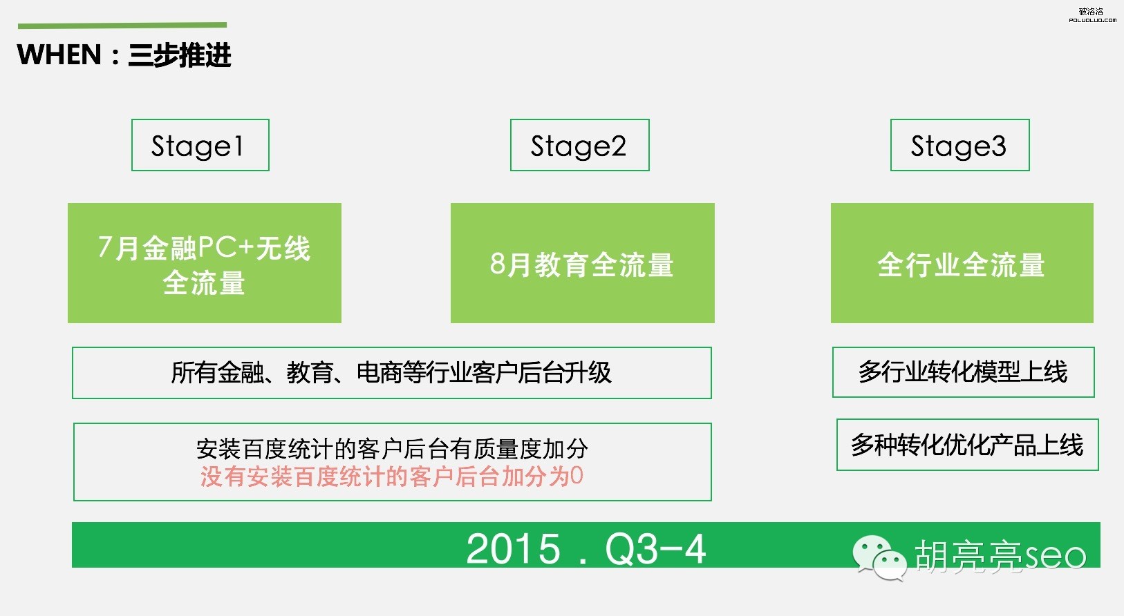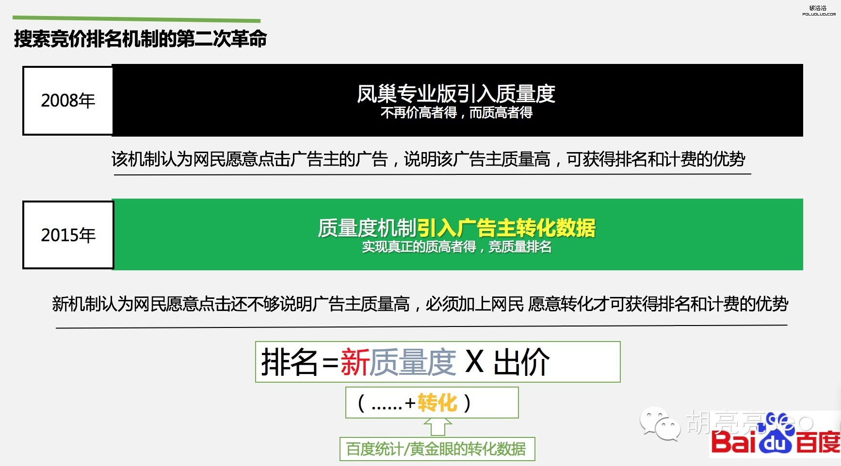 所以,百度的競價排名,其實是引入了一個新的算法機制,我姑且叫"轉化質量度",而這個轉化,只有通過百度統計推廣版才能進行計算,所以才會有百度統計是SEM"作弊器"這個比喻,當然,它是基於轉化數據的一種公平計算機制,目前有測試賬戶已經在測試,時間上的進度,大家可以看看,基本上今年年底會全網實施,留給大家的時間不多了。