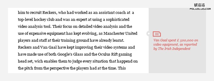 於是有了邊欄注釋。它會顯示在相關段落的旁邊,同時有一個簡短的標簽描述鏈接的內容。同時還會有一個小圖標告訴你鏈接具體是視頻、音頻還是文字報道。你也可以把它看作一種類似清單的設計,讀者不必記住某個鏈接的具體位置,所有的參考鏈接都會一目了然地出現在右邊欄裡,方便查閱。