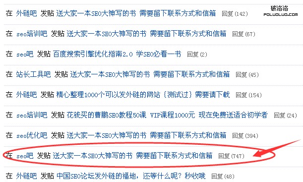 這個是當時百度貼吧引流帖子地址是“免費送SEO書籍”引到我論壇精准用戶的地址。當時一個送SEO書籍的帖子回復能幾百留言,關閉半年注冊,要不估計一帖子能回復能破,5000千人回復。已經半年不管理這個論壇,偶爾維護一下,最近一直准備在賣這個論壇。