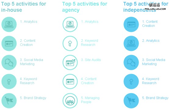 今年,我們把後續的問題分為三個主要部分:搜索引擎優化、社會化類以及內容類。即使是同行業出現許多新的營銷方式,依然有78%的受訪者把SEO作為日常工作的一部分。另外,有近49%的人在做內容營銷的工作,41%的人參與社會化營銷。