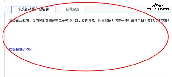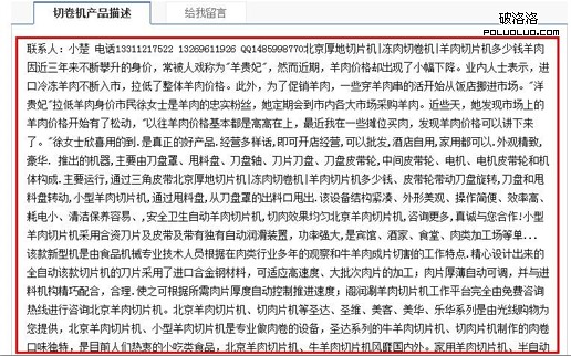 首先,是產品頁面的內容信息太少,僅僅幾十字,無法滿足用戶的需求。不少B2B站點都有這麼一個問題,可以說是B2B站點的通病,而且很多站長都沒有在意這個,致使不少B2B被百度降權。可能有的站長會說:“這些產品內容都是用戶發的,又不是我們自己發的,我們也控制不了的”。其實問題就出在這,既然是用戶發的內容,作為管理員的你是有權限審核內容信息的,看到這樣的內容就該立即刪除並警告發布者,這樣以來不就可以了嗎?