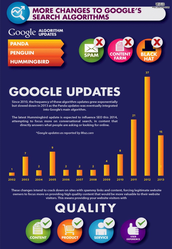 從2010年開始谷歌的算法調整就非常的頻繁,熊貓、企鵝、蜂鳥算法等都是典型的例子,而這些算法都主要是打擊那些低質量鏈接和內容的網站,打擊黑帽SEO對互聯網帶來的不良影響。而那些給用戶提供高質量內容的網站將會獲得更好的排名,得到更多的訪客。這就意味著你的網站需要給用戶提供高質量的內容、產品、服務、用戶體驗等。