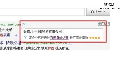 目前,在百度搜索框中輸入某些關鍵詞並搜索到一些自然網站排名時,把鼠標移動到百度推廣藍色V認證上面,發現沒有顯示百度推廣身份認證和安全聯盟認證字樣,而是顯示“V已經通過百度信譽認證”。由此看來,百度已經將百度推廣認證和安全聯盟認證的字樣取消並由百度信譽認證取而代之。
