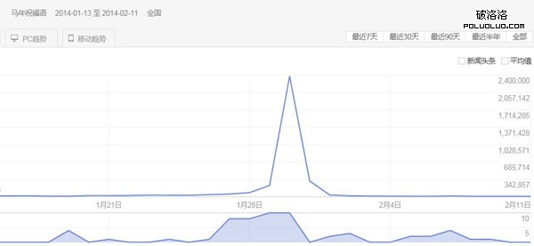 如“馬年祝福語”這個關鍵詞就是一個十分典型的例子,在其頂峰時指數高達“407366”(圖1),然而幾天後的今天,它的指數為“13627”(圖2),這個關鍵詞的爆發非常具有典型性,完整地體現一個關鍵詞從誕生到發展再到逐漸低迷的結局(圖3),非常值得我們留意。