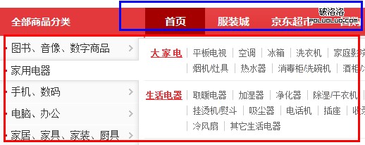 以一個典型的電子商務網站京東為例,如圖所示,頂部導航顯示主要功能,左側導航顯示產品分類,光標放在產品分類文字上時會顯示更細的產品分類。