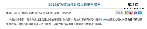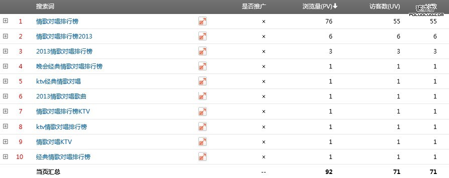 編號1288的頁面,顧名思義就是較之3230更早的頁面,這是筆者在上年5月份更新的一篇文章,題為“2013KTV歌曲排行榜之情歌對唱榜”,這張頁面目前已經有差不多2萬次浏覽,而且趨勢比較平穩,並非大起大落的類型,由於流量已經集中在某幾個關鍵的長尾詞中,因此每天所帶來的IP相對穩定。