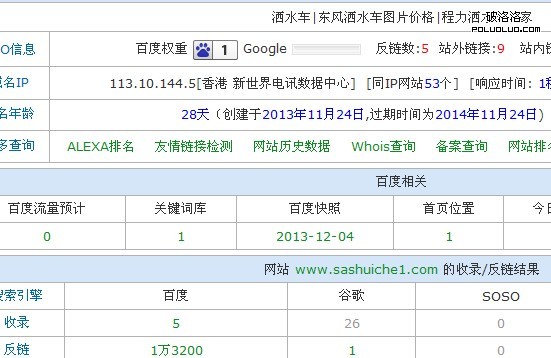 網站的外鏈建設也是不容忽視的,其實外鏈建設不在於數量,而在於質量,這一點我深有體會。因為在剛開始的一個禮拜,我只注重數量,然後就在B2B平台和一些免費平台上發信息,外鏈的增長速度還是很快的,一個禮拜最多的時候達到600多吧,但過了兩天我再查詢,一下只剩下幾十了。這讓我感覺到不能靠這些來做外鏈了,就選擇了另外一種外鏈方式—博客,申請了好幾個博客,例如:新浪、天涯、和訊都不錯,申請好之後就在上面發博文,效果還是不錯的,就是時間可能要等的比較久,沒那麼快被百度收錄,而且質量也不是很高,可以先養起來,慢慢你會感覺的博客還是很不錯的一種外鏈方式。感覺效果不怎麼,我又選擇了現在最常用的外鏈方式——權威網站投稿,高流量論壇發帖,這也是效果最明顯的方式,只是難度也相對更高。在這篇稿子發表的前半個月,我基本上就泡在站長之家、A5站長、SEOWHY、落伍者、推一把這些站長網上面,但效果最好的還是站長之家、A5這兩個網站,只是審核的更嚴格,可能對新做SEO的站長比較難,但多學習,多交流,還是能行的,貴在堅持。下面是我網站的截圖: