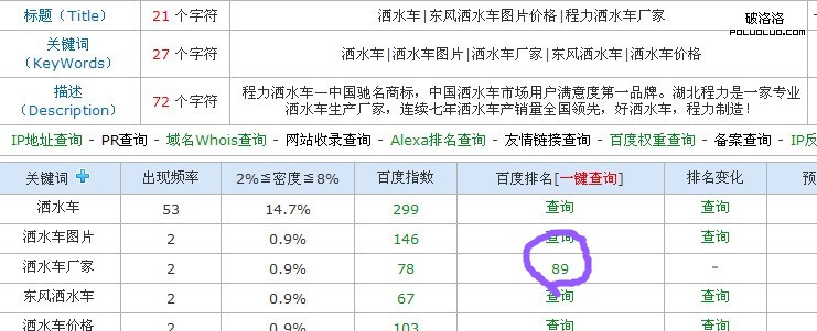 這也是一項非常重要的工作,我的網站在選擇關鍵詞、名稱、標題的時候,我參考了所有排在前20名的網站,我做的產品是灑水車,然後我就百度“灑水車”,將排在前20的灑水車網站全部用站長工具查詢了一遍,參考他們的網站關鍵詞、標題、名稱,總結之後制定了自己的網站關鍵詞、標題、名稱。雖然不知道效果到底如何,但既然他們能排到前面肯定不會錯。其實還有一種方法也很不錯,就是詢問你身邊的親朋好友(最好不是你自己行業的)看他們在網上購買你的產品時會如何搜索,最好多問些人,總結得出適合自己的關鍵詞、名稱、標題。我的關鍵詞也有排名了,雖然不高,但堅持下去總有一天我也會上首頁。