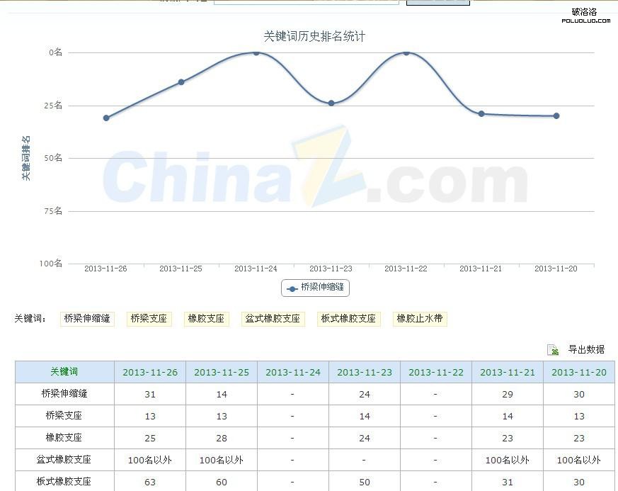 從上圖可以看出,網站最近一周的排名變化,一直處於不穩定的狀態,波動最大的是“板式橡膠支座”這個詞,波動幅度達到了33名之多。