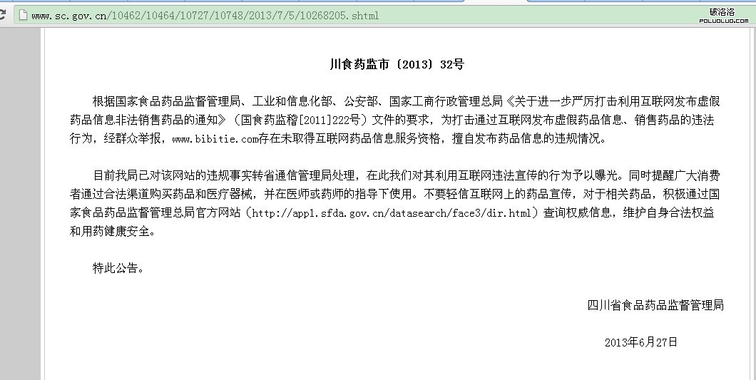 我今天在百度新聞源搜了一下比比貼官方地址,一看嚇一跳,原來四川人民政府網站曾官方批評過,具體有一點說明是:“經群眾舉報,比比貼(官方寫的是網址)存在未取得互聯網藥品信息服務資格,擅自發布藥品信息的違規情況。目前我局已對該網站的違規事實轉省通信管理局處理,在此我們對其利用互聯網違法宣傳的行為予以曝光。同時提醒廣大消費者通過合法渠道購買藥品和醫療器械,並在醫師或藥師的指導下使用”。官方表明已轉省通信管理局處理,而我也在SEO站長工具查了下比比貼網站的備案信息,最近通過的時間是2013年07月30日,筆者猜測通信管理局處理過,後來比比貼又重新備案了。