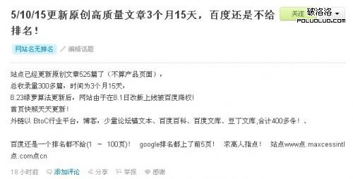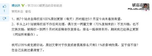 從這個人的發表當中,我們可以看出站點被降權後原創內容更新經歷了五個多月至今還是未看到希望,而其它的幾個站點沒有悉心的照料卻反而排名稀奇的恢復了,這個讓人真心覺得百度這是再跟我們開極大的玩笑。