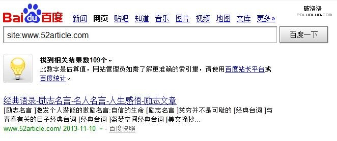 令人哭笑不得的是,在貼上上圖的同時,筆者重新在百度SITE一下網站,收錄數從109又到了99,昨天的收錄數是350.下滑趨勢非常明顯。