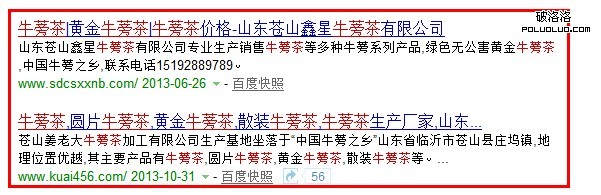 舉個例子:筆者拿牛蒡茶這個關鍵詞來舉例吧,從下幅圖可以看到牛蒡茶出現的位置是標題的首位,而後面的位置多次出現牛蒡茶,說明這些企業站長鐵了心要優化牛蒡茶這個關鍵詞,所以可以看出牛蒡茶這個關鍵詞競爭程度還是非常強的,建議整體分析後在做優化,防止優化效果出現不理想。