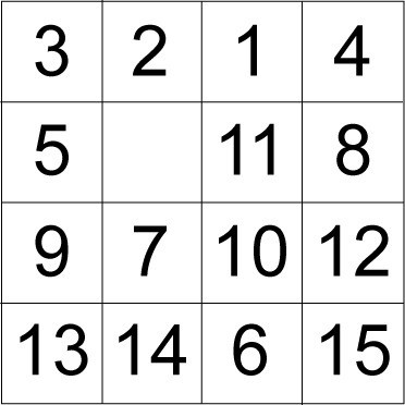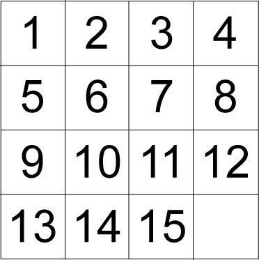 本文中,我們側重於一個名為 15 puzzle 的 toy 域。這個簡單的域有易於理解的屬性,是評估啟發式搜索算法的一個標准基准。(有人將這些拼圖稱為 AI 研究的 “果蠅”。)15 puzzle 是一種滑塊拼圖,在 4×4 網格上排列 15 個滑塊。一個滑塊有 16 個位置可供選擇,總有一個位置是空的。與空白位置相鄰的滑塊可從一個位置滑動 到另一個位置。其目的是滑動滑塊,直至達到拼圖的目標布局。圖 4 顯示了隨機布局下的滑塊拼圖: