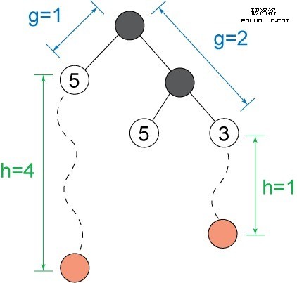 在 圖 2 的示例中,前沿有三個節點。有兩個節點的 f 值是 5,一個節點的 f 值是 3。接下來展開 f 值最小的節點,該節點直接通往一個目標。這樣一來 A* 就無需訪問其他兩個節點下的任何子樹,如圖 3 所示。這使得 A* 比廣度優先搜索等算法要高效得多。