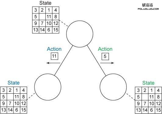 一開始似乎不太直觀,但我們可以用圖形建模 15 puzzle,將滑塊的每個可能布局表示為節點。如果有一個操作將一個布局轉化為另一個布局,一個邊緣連接兩個節點。在該域中,一個操作將滑塊滑到空白區域。圖 4 展示了這一搜索圖: