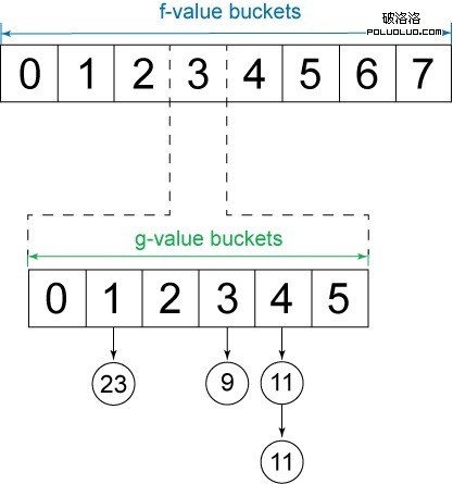 精明的讀者會注意到,如果我們實現這裡描述的 1 級桶優先級隊列,就失去了使用 g 值打破節點間關系的能力。您之前應當已經意識到,以這種方式打破關系是一種值得的優化。為了維持這一優化,我們可以實現一個嵌套 桶優先級隊列。1 級存儲桶用於表示 f 值的范圍,嵌套級別用於表示 g 值的范圍。圖 8 展示了這一數據結構: