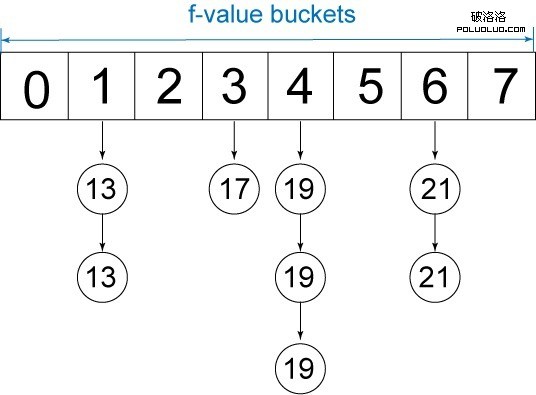 另一個替代方法是使用基於桶的優先級隊列。假設我們域中的操作成本在一個狹窄的值域內,我們可以定義一個固定的存儲桶范圍:每個 f 值一個存儲桶。當我們生成一個節點時,只需將它放在與 f 值對應的存儲桶中。當我們需要訪問隊列頭時,可以首先從 f 值最小的存儲桶看起,直至我們找到一個節點。這種數據結構叫作 1 級桶優先級隊列,它支持恆定入列和出列操作。