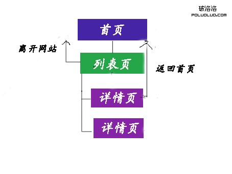 上面是筆者畫的一張網站的結構圖片(不要噴我,筆者處理圖片能力不是一般的差),頂部的是首頁部分,接著是列表頁面,最後是詳情頁面,有人會問為啥要給大家看這個結構圖呢?因為從這張圖片中我們可以分析用戶的兩類詭異行為。第一訪問者在導航類頁面中途離開(這個問題在企業網站中經常出現,至少筆者負責的5個小企業站都是如此),另一種是訪問者從內容類頁面返回到導航類頁面。這兩種行為不是太符合我們網站導航架構的的設計初衷,都是我們不希望看到的行為。下面我們具體來說明下這兩類用戶行為。