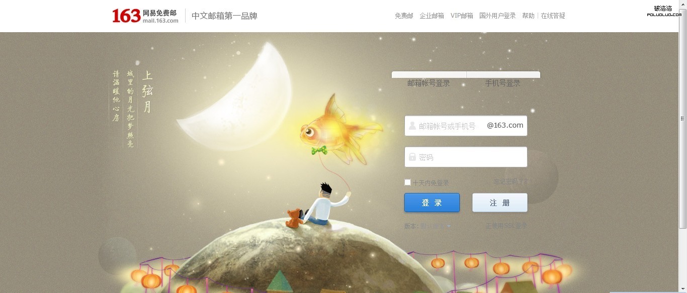 在網頁設計中,設計師們順應時代的潮流,加入繪畫元素,使界面更具有表現力。繪畫藝術的表現技法相當繁雜,深谙此道的設計師們會從中選擇適合該網站的風格和表現手法。插畫藝術和網頁設計的結合,使頁面更富有藝術魅力。例如163郵箱的登錄頁面,運用簡單的色彩,描繪出一個男子手握住一只氣球的繩子,對著月亮,眺望著遠方。構圖簡單,意境深遠。163郵箱用於交流通信,在互聯網還未發展起來的時候,人們的通信都是依靠信件,這可以勾起用戶對以前的懷念,尤其是80後一族。在他們的青春期時代,很多人依靠信件來往,筆友滿天下。那是他們內心深處的一段純真回憶。由此可迅速建立與用戶的感情,喚起其心理的共鳴,增強歸屬感和親和力。如果你的網站面對的主要服務對象是文藝青年,那麼此種風格是你的首選!