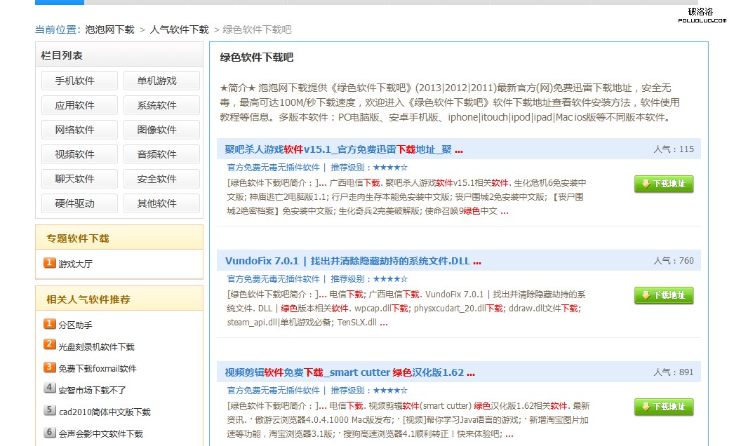 第三個案例的頁面主題為“綠色軟件下載吧”,可以看的出來這個頁面是某個專題的搜索結果頁面,但是出來的結果跟主題的相關性不高,中文語義拆分的嚴重用戶體驗不高,筆者認為這一部分可能是站點程序造成,也可能是站長故意為之和第二條一樣只是針對搜索引擎制造的頁面,不管怎麼說。既然百度已經指出此類頁面將被嚴厲處理,作為站長的我們就檢查下自己的站點,不要被波及到。