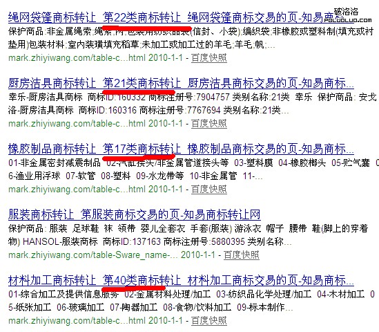 3、那些未收錄的頁面都是最後一級,單個商標轉讓的信息。所以我們要改造單個商標轉讓的頁面。要把單個頁面的展示象45個分類那樣的頁面看齊、下圖是百度喜歡收錄的頁面圖片